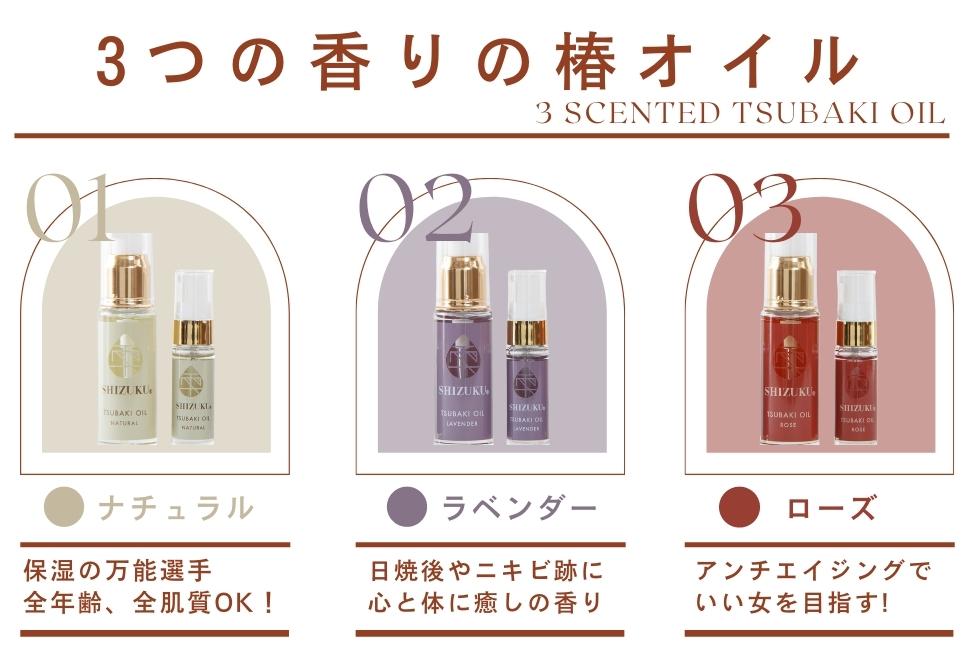 椿オイルローズ/ラベンダー/ナチュラル30㎖の各1本づつをセットにしました。